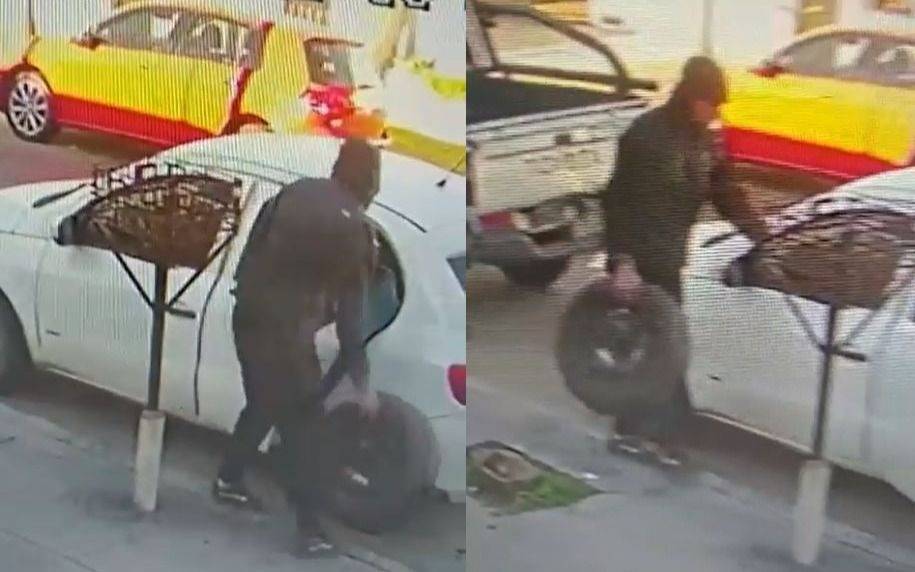 En las imágenes se puede observar como el hombre bajó del vehículo y, con total tranquilidad, se acercó a la camioneta. Con un cortacadenas, se tiró al piso y comenzó a forzar el sistema de seguridad para sacar la llanta.