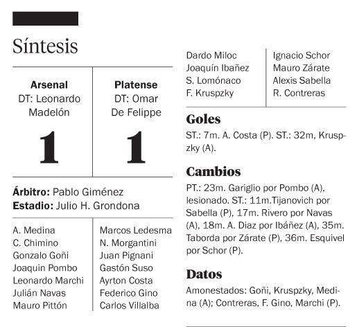 Arsenal y Platense igualaron anoche 1-1 en Sarandí en un partido discreto, donde el Calamar se quedó con las ganas de treparse a lo más alto de las posiciones.