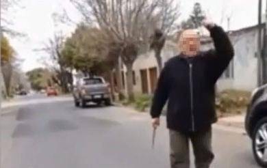 “Hoy estuve todo el día y no vino nadie a dejarme una bicicleta. No vino nadie. La p… que te parió te voy a matar. Tomá todas las fotos que quieras. No vino nadie. Te voy a matar hijo de p…”, se escucha decir en el video a un sujeto vestido con una campera azul y con un elemento cortopunzante en la mano derecha.