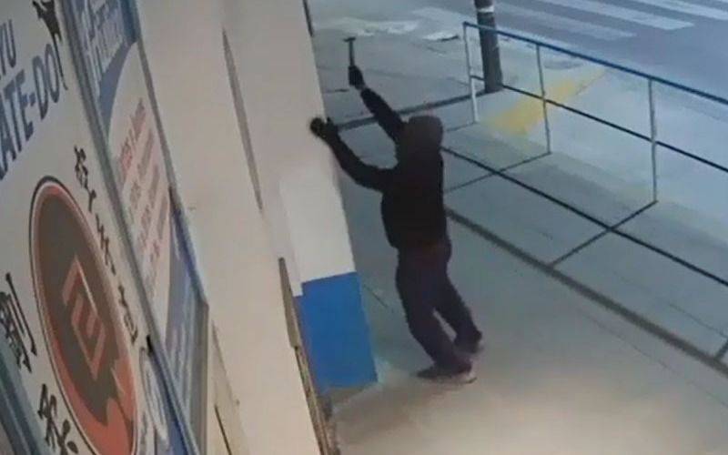 Según se puede apreciar en las imágenes, un encapuchado realiza dos ataques en cuestión de minutos con un elemento: el primero ocurre a las 01:33 del sábado, mientras que después vuelve a atacarlo 11 minutos más tarde.
