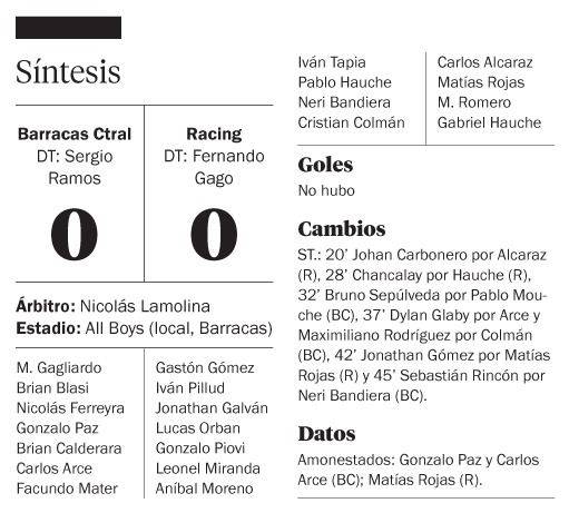 Racing sufrió ayer ante Barracas Central, igualó sin goles en el estadio de All Boys y no pudo acercarse a la punta, que sigue en poder de Atlético Tucumán, a pesar de que ayer dejó su invicto en el Viaducto ante Arsenal.