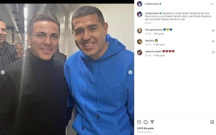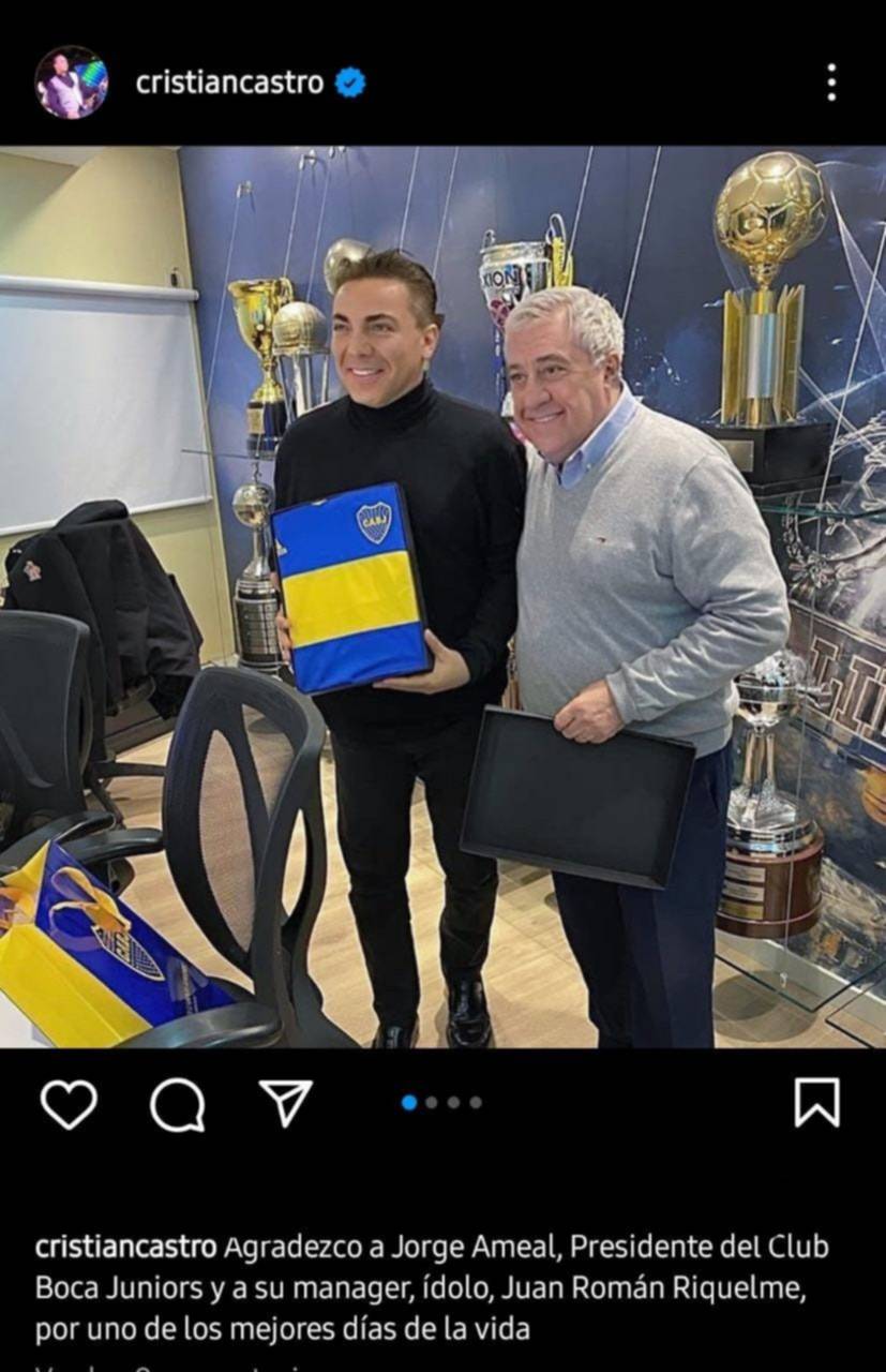 Cristian Castro y las personalidades del club se mostraron con sonrisas en las fotos que se sacaron juntos, pero el artista tuvo una confusión con los cargos y tareas y se hizo viral: “Agradezco a Jorge Ameal, Presidente del Club Boca Juniors y a su director técnico, ídolo, Juan Román Riquelme, por uno de los mejores días de mi vida”, había escrito, texto que luego tuvo que editar, ante el revuelo que se armó con su posteo.