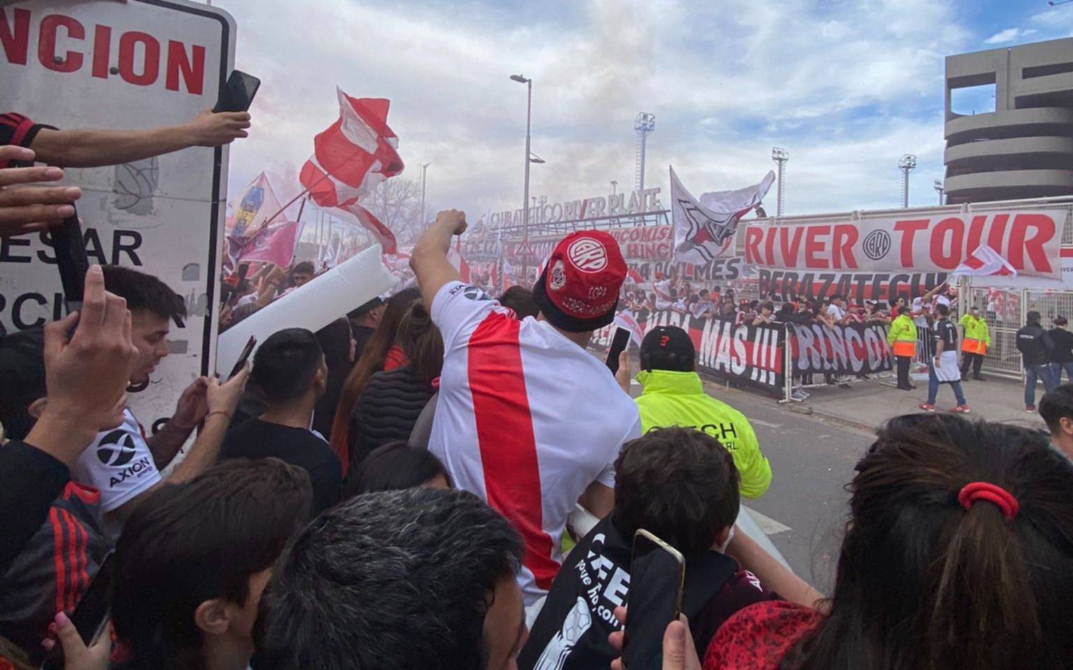 En la previa del encuentro, los hinchas de River se acercaron a las inmediaciones del estadio Monumental para hacer un banderazo y alentar al plantel antes de que empiece su viaje hacia el estadio.