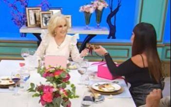 Una de las estrellas invitadas en el regreso a la TV de Mirtha Legrand fue Moria Casán. Y la ex vedette dio la nota con un lujoso regalo para la diva de los almuerzos, que anoche en El Trece reunió también en su "mesaza" a la pareja de la ex vedette, el deportista y ex funcionario público Fernando “Pato” Galmarini, al músico José Luis “el Puma” Rodríguez y al periodista Baby Etchecopar.