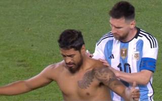 La locura causada por Messi llegó a su máxima expresión en un fanático que burló a los controles de seguridad e ingresó a la cancha en busca del ídolo cuando se jugaban 18 minutos. Un ejército de guardias lo controló en el medio del campo de juego y lo sacó a pesar de su resistencia.