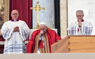 Al término de la ceremonia, de pie, ayudado por su bastón y sin paramentos, Francisco bendijo el ataúd y lo tocó con su mano para despedirlo.