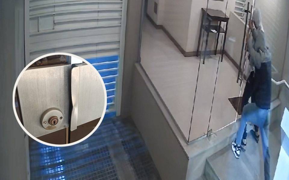 Mientras circulaban los vehículos por la calle, los hombres simulaban estar esperando en el ingreso del edificio, pero cuando nadie se encontraba cerca volvían a forzar el acceso principal del edificio.