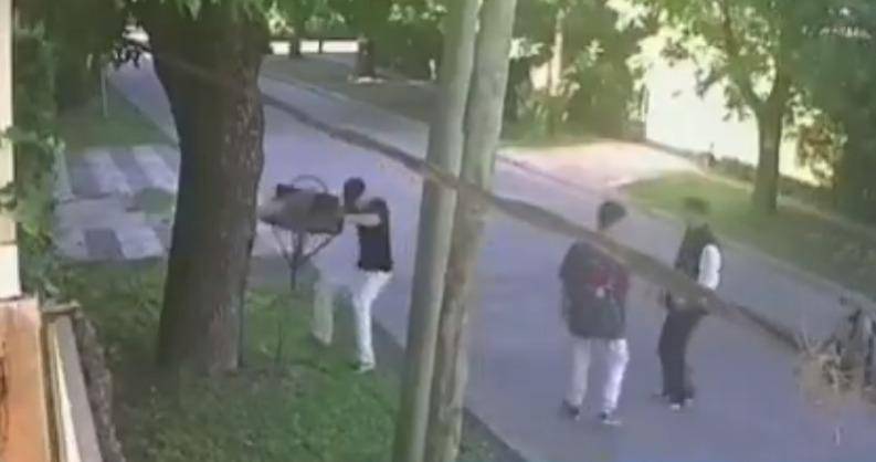 Un insólito episodio se registró en las últimas horas en Gonnet, donde uno de los integrantes de un grupo de jóvenes arrancó un cesto de residuos, se lo cargó al hombro y se lo llevó.