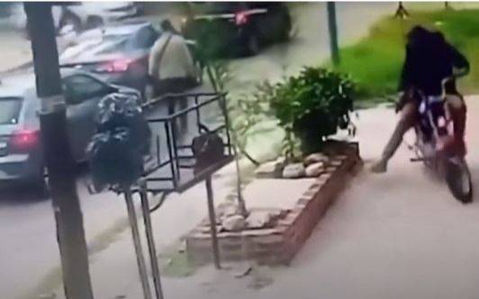 En un video filmado por las cámaras de seguridad de la cuadra, se puede observar a dos individuos en una moto. Uno de ellos desciende en la calle y el otro, con el vehículo, sube en la vereda.
