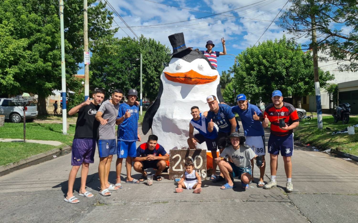 "Son los Pingüinos de Madagascar. En realidad son cuatro los pingüinos, pero hicimos dos nomás. Los otros dos están en el sur", bromeó uno de los jóvenes que integra el grupo muñequero. "Nos agarró la lluvia, lo pudimos salvar y por ahora sigue. Lo tapamos todas las noches por la lluvia", destacaron.