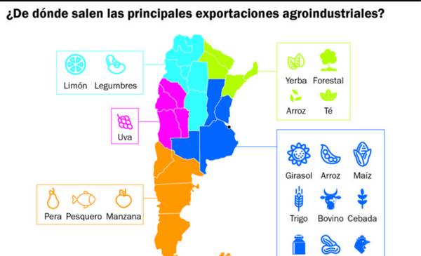 “Los productos agroindustriales salen desde cada rincón del país, es una actividad totalmente federal. Cada rincón de la Argentina tiene miles de trabajadores que se especializan en las producciones de esa región. Así, podemos ver que en la Patagonia lo que más se exporta son los rubros pesqueros, peras y manzanas. En la región pampeana son mayoría soja, maní, girasol, maíz, trigo, cebada, carne de vaca, lácteos y carne aviar. En cuyo prevalece la cadena vitivinícola. En el NEA lo que más se exporta es el complejo forestal, té, yerba y arroz. Por último, en el NOA se especializan en limón, porotos, y garbanzos”, afirmó Miazzo.