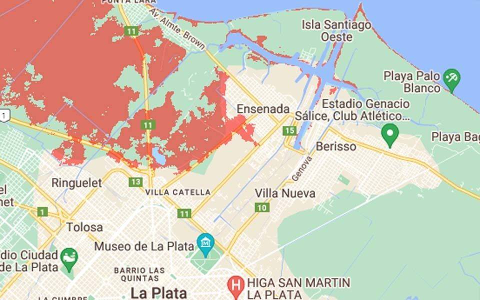 El mapa, creado por Climate Central, permite ver los efectos que el crecimiento del nivel de los océanos tendrían en el mundo, y muestran el alcance de las aguas sobre la costa de la provincia, y sobre todo Berisso, Punta Lara, Berazategui, Quilmes, Avellaneda y la Ciudad de Buenos Aires.