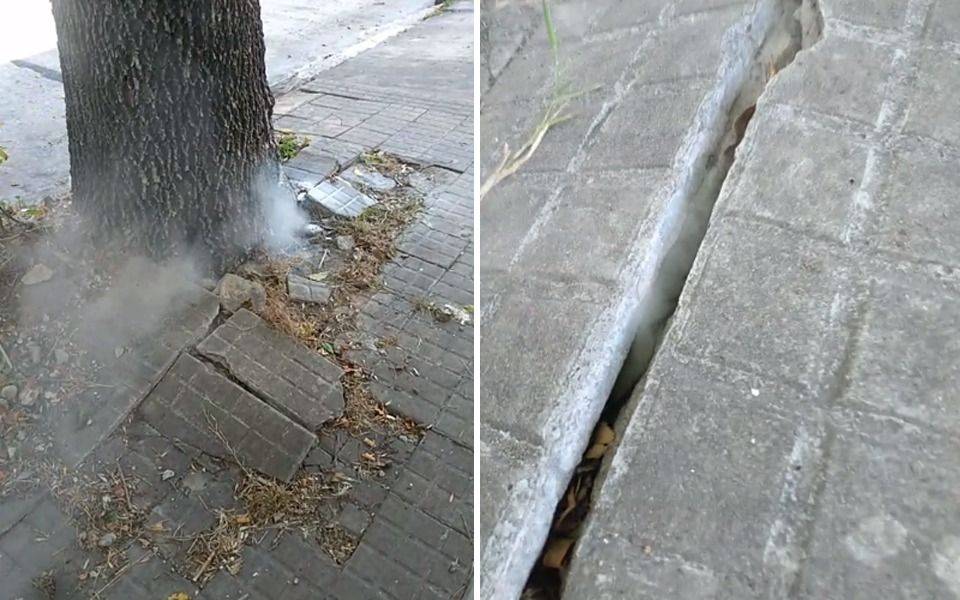 Si bien no se observa fuego, el humo brota desde abajo, desde la base, e incluso desde las raíces, ya que se filtra por las baldosas y sale a la superficie.