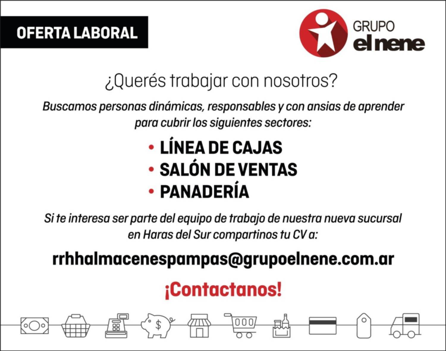 GRUPO El Nene convoca para sumar a esta nueva sucursal en Haras al Sur a personas preferentemente de la zona para cubrir los sectores de:
