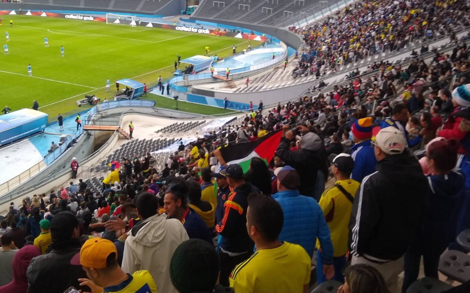 Luego de haber concluido el encuentro que terminó con un triunfo de Colombia sobre Israel por 2 a 1 en el final, un simpatizante de Colombia exhibió una bandera de Palestina y desató la furia de la parcialidad que hinchaba por Israel.