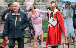 Carlos y Camila llegaron a la puerta occidental para la Abadía de Westminster pero la lluvia y algún problema en el coche de los príncipes de Gales hizo que entraran retrasados por unos minutos. El pasillo empapado hizo que la entrada de Camila no fuera de las más elegantes. Tuvo que recoger su inmaculado vestido blanco hasta la rodilla y sus damas tuvieron que sostener la capa para que ambos llegaran más o menos limpios.