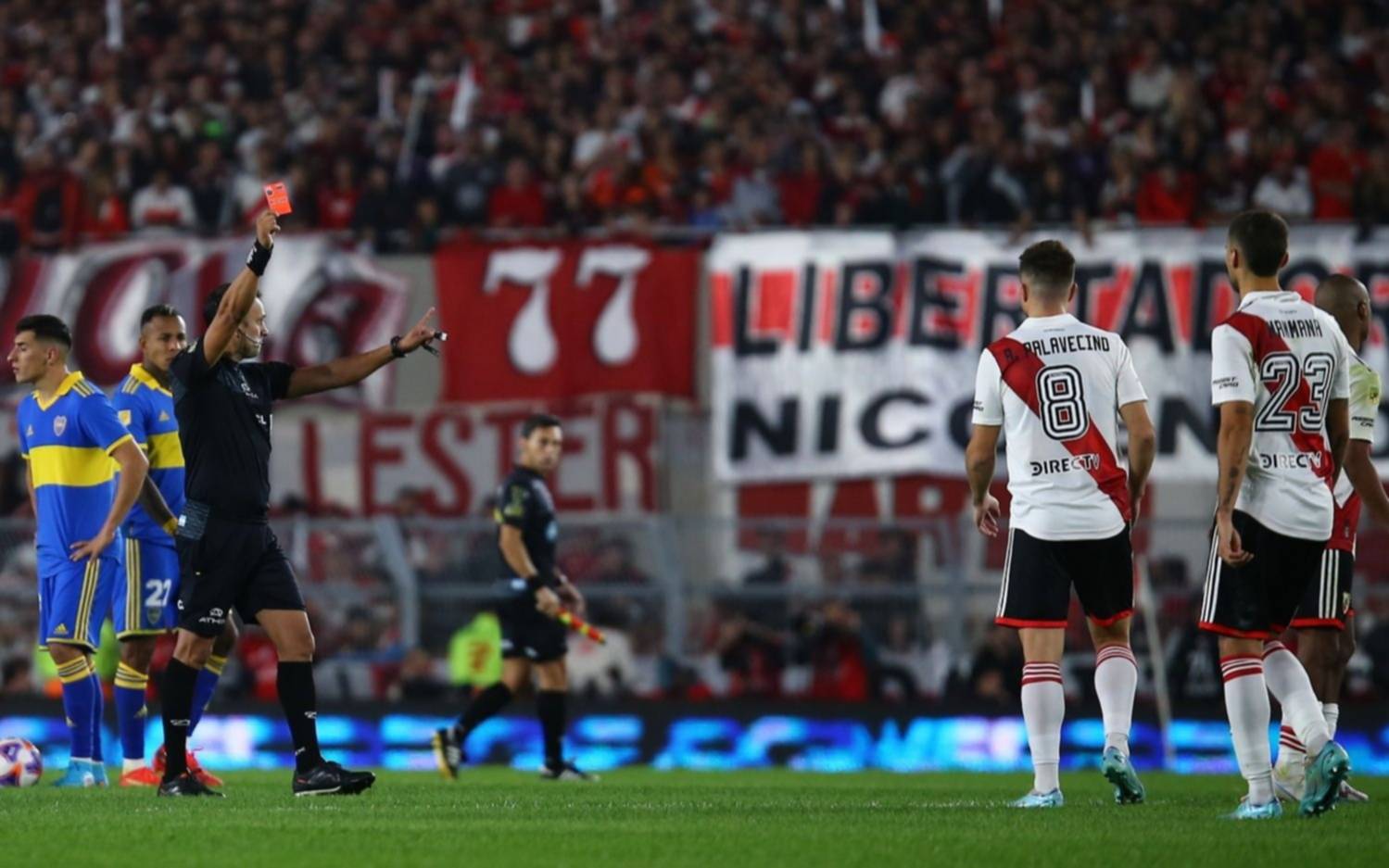 Pero llegó el desborde por la izquierda de Agustín Palavecino, el centro al punto del medio del área casi razante para Pablo Solari. Junto a él estaba el pibe Sandez, que había ingresado hacía dos minutos para asegurar el 0-0. El defensor de Boca llegó un segundo después que el expremo de River, lo tocó a la altura de la tibia y obligó al reclamo del equipo local.