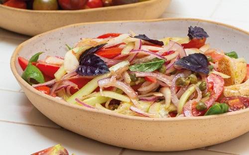 2. En un bol colocar los tomates, la cebolla en juliana cortada bien finita, el apio, las alcaparras y el pan en cubos, esto lo mezclamos y lo dejamos marinar por 15 minutos con la vinagreta.
