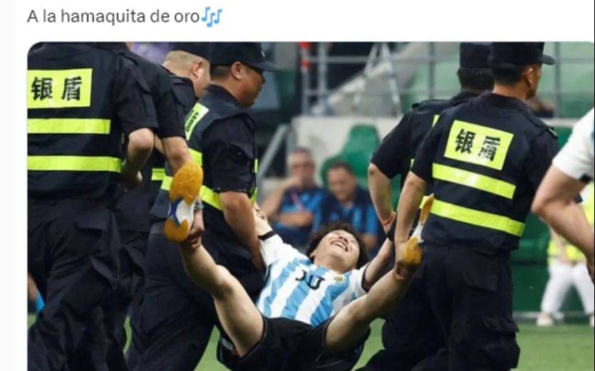 En medio de la algarabía, un joven fanático chino, se lanzó sobre el campo de juego y fue abrazarlo directamente al actual jugador del Inter de Miami (MLS). Tras lograr su cometido, fue por mas. Buscó a Emiliano "Dibu" Martínez, que estaba justo parado en el campo de juego (esperando que se ejecute un tiro de esquina a favor del equipo de Lionel Scaloni) y le chocó "los 5".