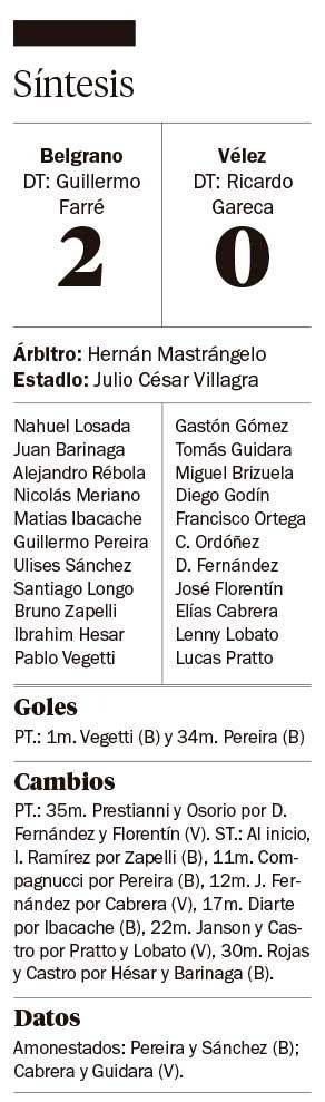 Belgrano de Córdoba superó ayer a Vélez por 2 a 0, en el estadio Julio César Villagra, en la continuidad de la 19na. fecha de la Liga Profesional de Fútbol (LPF).