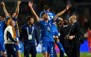 El sector del público de Italia en el Estadio Único, con una bandera y una dedicatoria / AFP