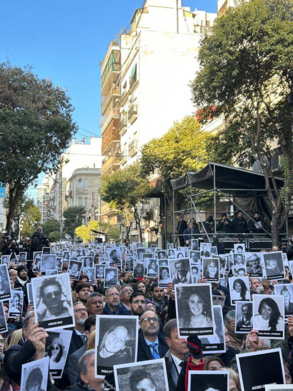 En el acto central, una sirena volvió a sonar a las 9.53 hora local, la hora exacta en la que aquel 18 de julio estalló la bomba que causó 85 muertes y más de 300 heridos en el peor atentado en la historia de Argentina, y del que la Justicia responsabiliza al Gobierno iraní de entonces y a el grupo libanés Hizbulá.