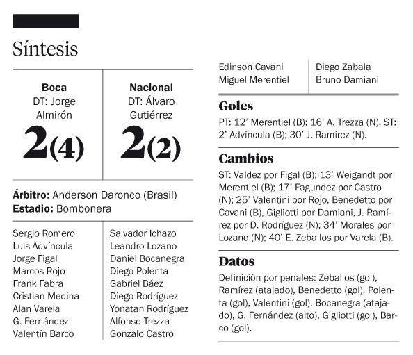 Le costó más de lo imaginado a Boca, al punto que necesitó de una tanda de penales para romper la paridad, pero terminó sacando una ventaja de 4-2 sobre Nacional de Uruguay, en las ejecuciones que fueron necesarias tras un empate 2-2, y se clasificó a los cuartos de final de la Copa Libertadores, instancia en la que se cruzará con el ganador de la serie a cargo de Racing y Nacional de Medellín, Colombia, que se definirá hoy en Avellaneda.