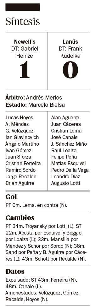 Fue un partido intenso, de ida y vuelta, entretenido y con llegadas, en el que el local pudo mantener la ventaja durante todo el partido. En el final hubo dos expulsados: Cristian Ferreira vio la segunda amarilla y la roja a los 41 en Newell’s, mientras que José María Canale, defensor de Lanús, fue expulsado a los 47 minutos por un manotazo a Brian Aguirre.