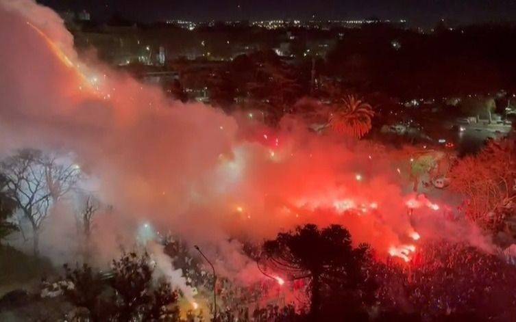 A todo trapo, la parcialidad local desplegó un importante operativo desde las 19 hs en la zona de 1 entre 54 y 58, para encender el cielo con los colores rojo y blanco. Así se vivió tanto dentro como fuera de UNO.