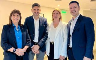 Pullaro, tras el triunfo, junto a Patricia Bullrich, su compañera de fórmula, Gisela Scaglia y Larreta / Télam