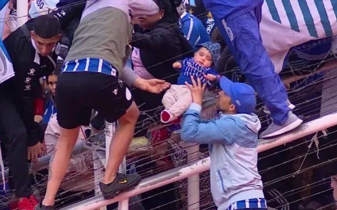 Entre empujones y corridas, los efectivos intentaron dispersar a los simpatizantes con gases lacrimógenos, que llegaron a gran parte de la tribuna local y mucha gente lo sufrió. Con sus ojos tapados, con un ardor indescriptible, intentaron acobijar a los más jóvenes. Pero una imagen vale mas que mil palabras: en medio del nerviosismo por la situación, una bebé fue "salvada" pasándola por arriba de un alambrado, para ser resguardada.