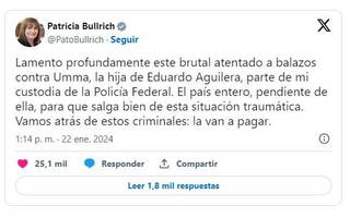 El gobernador de la provincia de Buenos Aires, Axel Kicillof, se solidarizó hoy con la familia de Umma Aguilera, la niña de 9 años e hija de un custodio de la ministra de Seguridad, Patricia Bullrich, asesinada ayer de un balazo durante un asalto en Lomas de Zamora, dijo que los responsables deben "pagar por lo que han hecho" y destacó la eficacia de la policía bonaerense en lograr "capturar" a uno de los acusados.