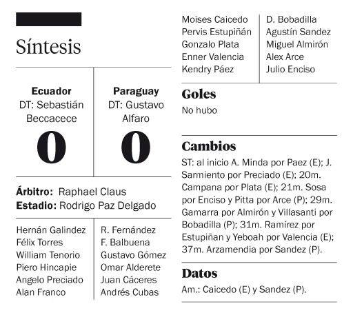 Ecuador igualó ayer 0-0 con Paraguay en Quito, por la novena jornada de la eliminatoria sudamericana para el Mundial norteamericano de 2026, y continuó momentáneamente en zona de clasificación directa.