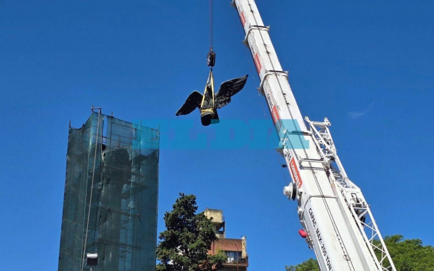 "Este jueves finalizó la remoción del águila, que estaba unida a su base por 14 remaches de bronce de casi 17 centímetros de longitud por 16 milímetros de diámetro. De este modo, se removieron las piezas existentes y se pudo desconectar de su base", precisó el informe técnico.