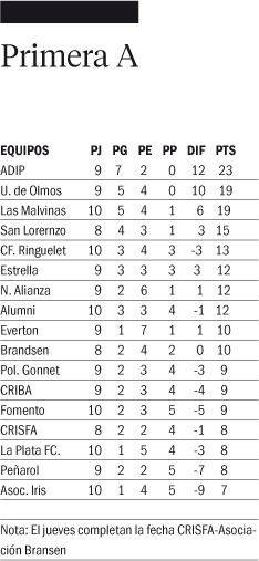 ADIP (23) volvió a vestirse de candidato. Y a medida que las fechas transcurren sus objetivos son cada vez son más firmes. Sin ir más lejos, ayer sacó adelante un partido “chivo” ante la Asociación Iris, que se había adelantado en el marcador gracias a la conquista de Rosano. Pero el Naranja, con un segundo tiempo altamente efectivo, dio vuelta la historia con los tantos de Casas, Catalano y Plastino, para terminar imponiéndose por 3-1 en Villa Castells.