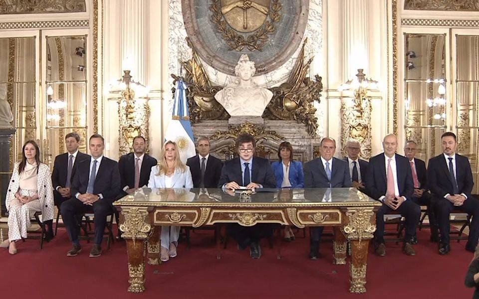 El jefe de Estado se mostró acompañado por el Gabinete completo, sentado en la misma mesa con el titular de ministros, Guillermo Francos, y con su hermana y secretaria general de la Presidencia, Karina Milei.