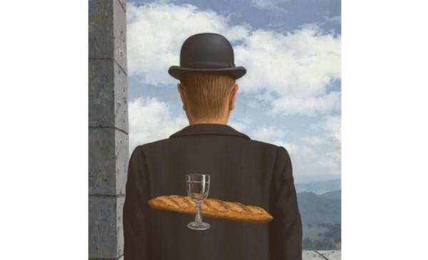 Datada en 1958, “L’ami intime” ofrece una visión intrigante del hombre del bombín, presentándolo como un “hombre común y corriente pero también misteriosamente anónimo”, su icónico sombrero hongo (o bombín) destacando en una representación casi silueteada desde atrás. No obstante, la verdadera magia de la obra se despliega al contemplar a través de la ventana del lienzo: un paisaje sereno y montañoso, un cielo nublado y la inusual presencia de una baguette y una copa de vino flotando en el aire detrás del protagonista.