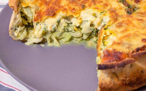 Rehogar, la cebolla con el puerro, luego agregar el resto de las verduras, cocinar, y escurrir para quitar el exceso de liquido. Una vez frío integrar con la crema, los huevos y el queso.