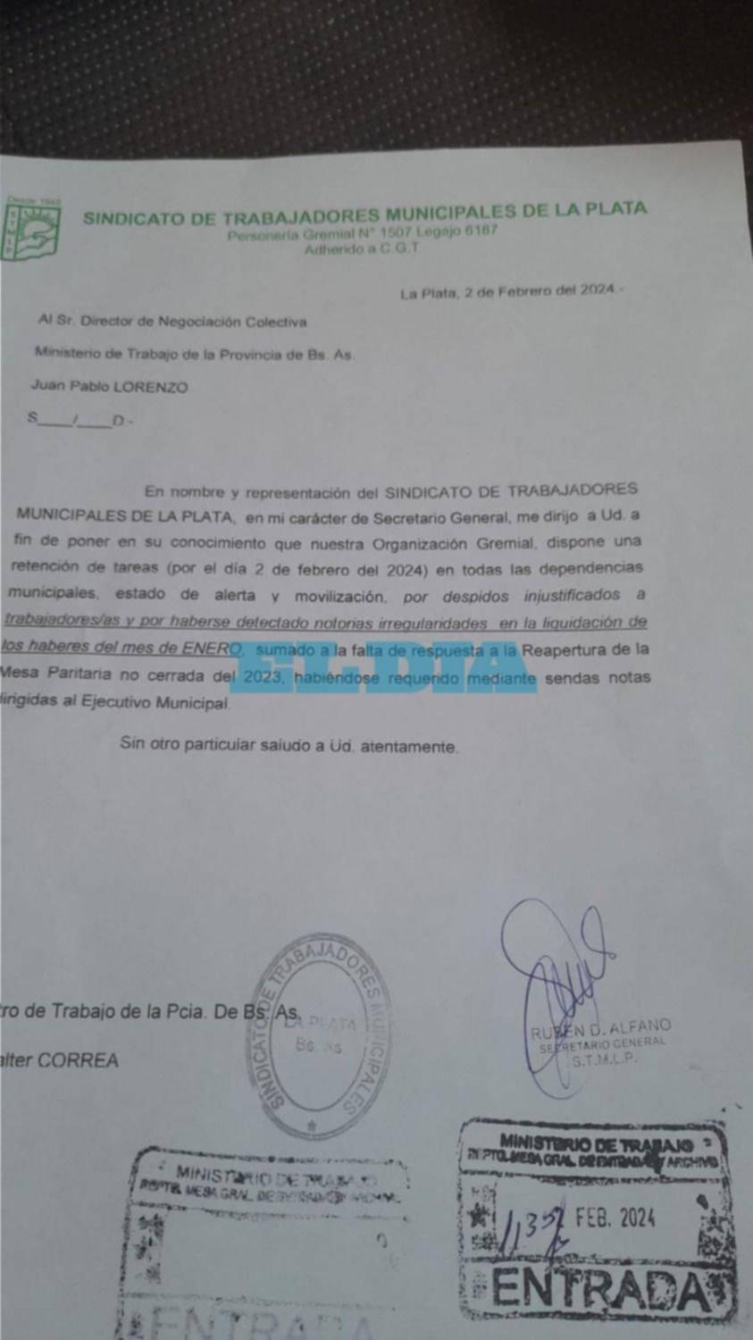 Autoridades del Sindicato de Empleados Municipales de La Plata presentaron hoy una nota al Ministerio de Trabajo bonaerense denunciando "despidos injustificados a trabajadores/as" y asegurado haber detectado "numerosas irregularidades en la liquidación de los haberes del mes de enero". Asimismo informaron que realizan hoy medidas de fuerza y que se encuentras en "estado de alerta y movilización".