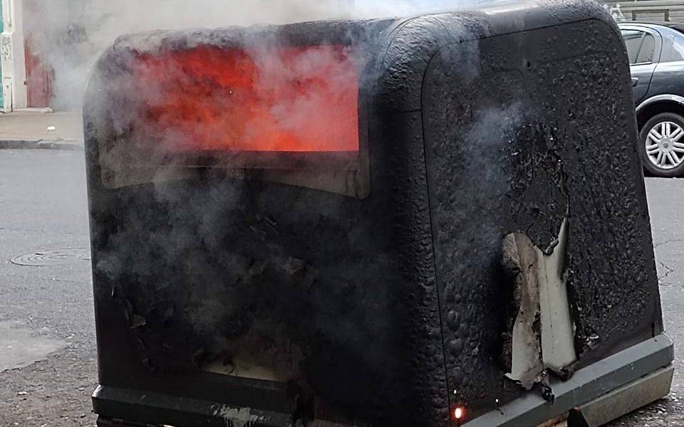 Pese a no saber si fue o no intencional, se puede ver al contenedor derretirse por fuera (siendo este de plástico) y adentro, con llamas rojizas en señal de que el fuego aún continúa.