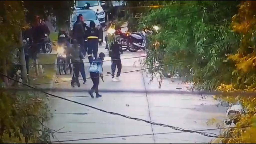 Una parte de la secuencia quedó registrada en una cámara de seguridad y la secuencia tiene ribetes de terror. Es que la filmación se vio claramente a un grupo de sujetos (varios con mamelucos de trabajo) desplazarle corriendo y en motos, y con palos y piedras en sus manos, dispuestos a todo o nada.