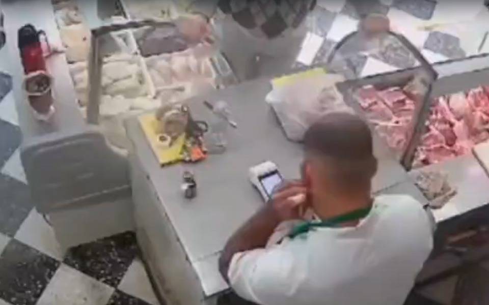 El insólito episodio se produjo en la zona de San Carlos, precisamente en un comercio ubicado 42 entre 141 y 142. Tal como se puede ver en las imágenes, el incidente alarmó al vendedor como también al cliente que terminó resguardándose detrás de la puerta de entrada al comercio. Rápidamente, el carnicero corrió del mostrador con una escoba al posnet, para evitar cualquier tipo de sorpresa con el artefacto.