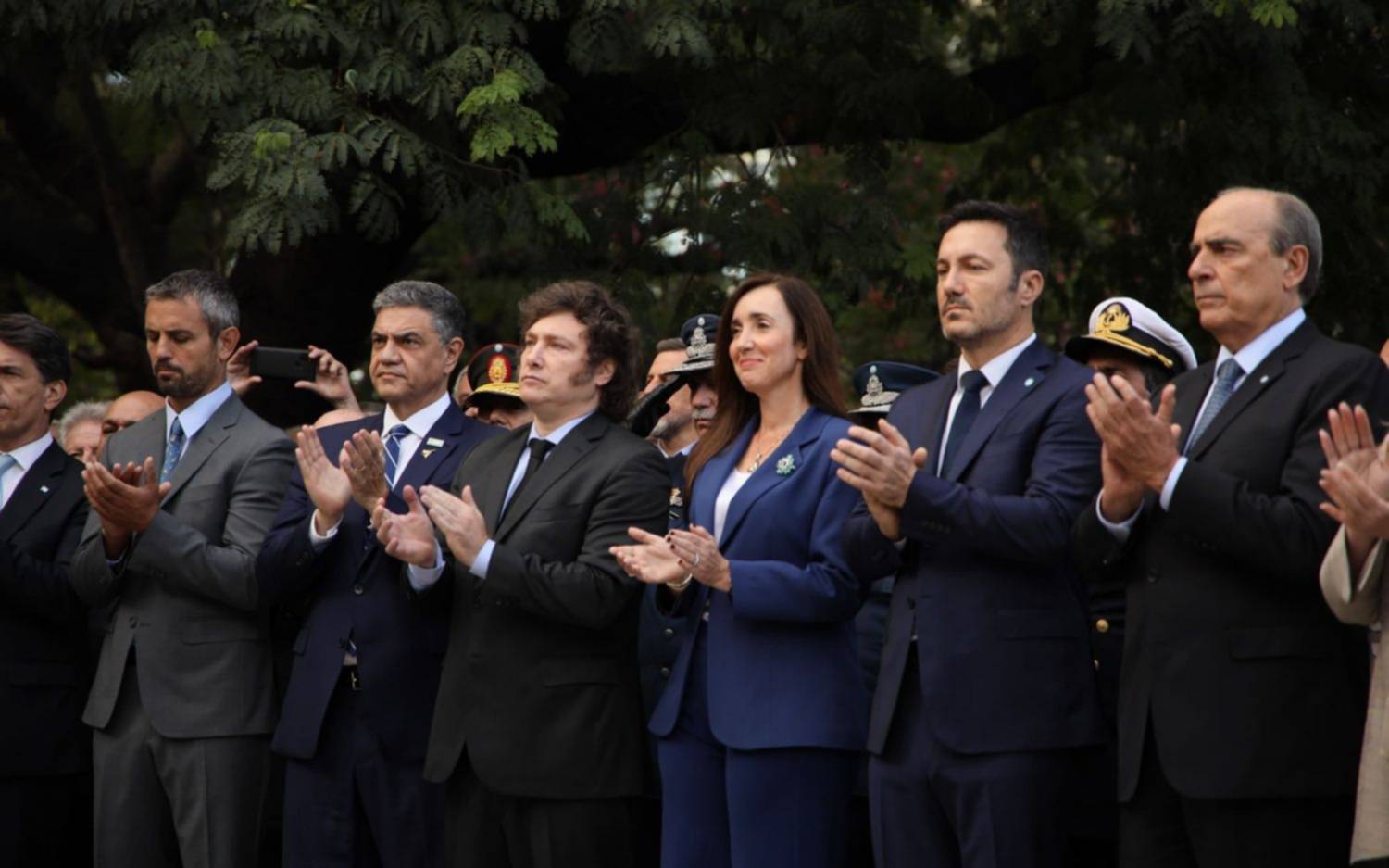 Durante la actividad, que se llevó a cabo en el Cenotafio de la Plaza San Martín y fue transmitido por cadena nacional, estuvo acompañado por la vicepresidenta, Victoria Villarruel, con quien mantuvo algunos cortocircuitos en las últimas semanas.