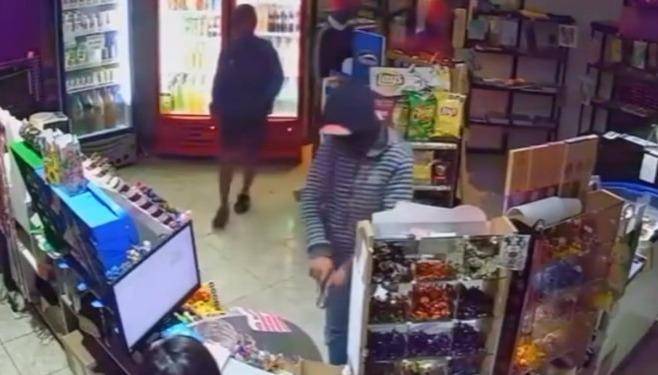En las imágenes se observa el momento en que uno de los sujetos exhibe una arma de fuego y le apunta a la chica que estaba a cargo de la atención al público.