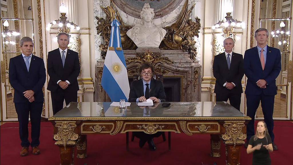 “El déficit cero no es una consigna de marketing para este Gobierno, es un mandamiento”, insistió Milei durante la cadena grabada en el Salón Blanco de Casa Rosada, en un escenario muy similar al de allá en diciembre cuando anunció el mega DNU aunque esta vez lo acompañaron solamente el ministro de Economía, Luis Caputo, el presidente del Banco Central, Santiago Bausili y su vice, Vladimir Werning, además del secretario de Finanzas, Pablo Quirno.