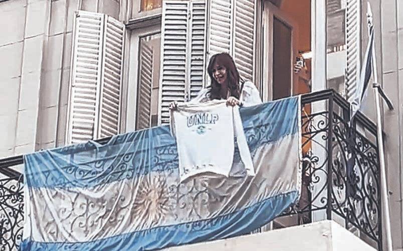 En medio de la movilización universitaria, la ex presidenta Cristina Kirchner apareció en un balcón del Instituto Patria y comenzó a flamear un buzo con las siglas de la UNLP. La ex presidenta más temprano había apelado a su pasado como estudiante de la alta casa de estudios de la Ciudad junto a Néstor Kirchner para salir en defensa de la educación pública.