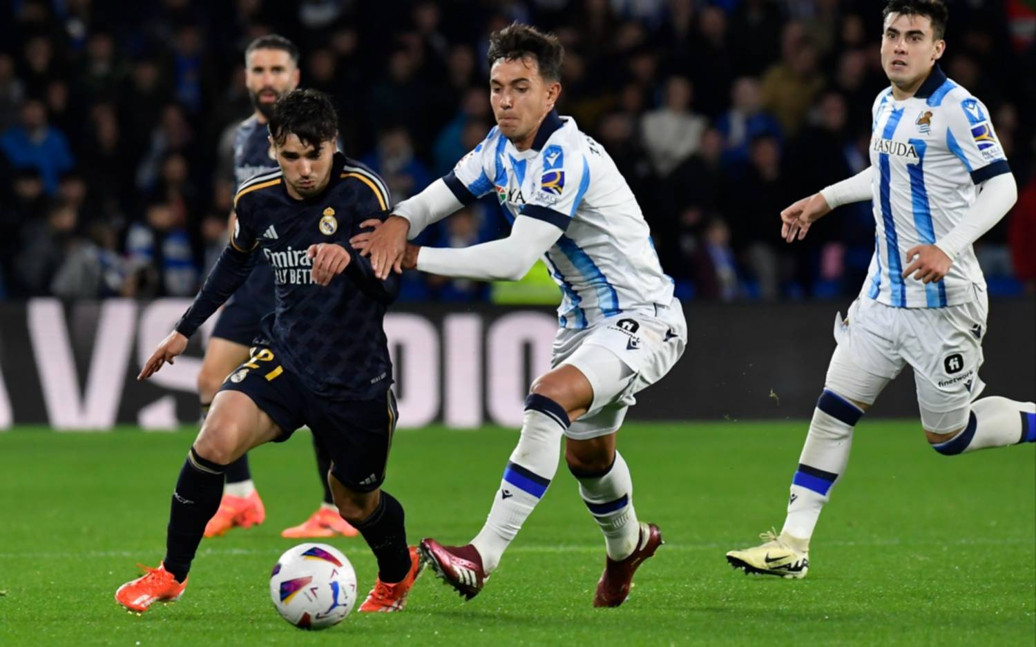 Real Sociedad logró anotar cuando Take Kubo recogió el balón en la frontal, recortó y disparó a gol, pero el árbitro revisó su decisión tras acudir al VAR y anuló el tanto por una falta previa sobre Tchouaméni.