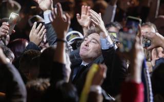 Milei se subió anoche al escenario pasadas las 21 (estaba previsto que comenzara a las 20) vistiendo un sacón negro y corbata e inmediatamente cantó el tema “Panic Show” de La Renga acompañado por la banda de rock Los Libertarios, que integran los hijos del diputado Alberto Benegas Lynch.