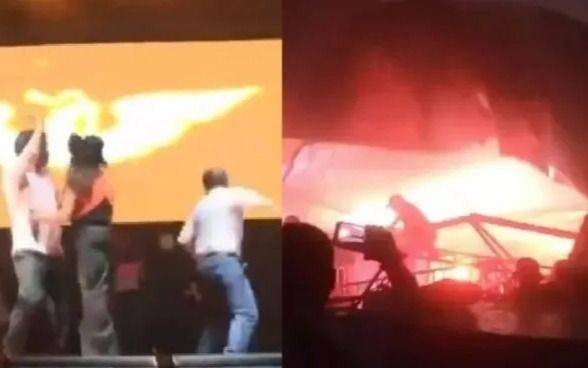 El escenario estaba montado en el campo de béisbol El Obispo. Según registros de redes sociales el accidente ocurrió alrededor de las 18 de este miércoles cuando un fuerte viento movió la estructura y todo quedó grabado por los presentes.