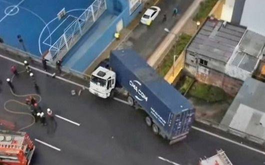 Sobre el accidente, se supo que el vehículo de gran porte quedó agarrado de dos autobombas de bomberos para que no se caiga y se vivieron momentos de tensión.